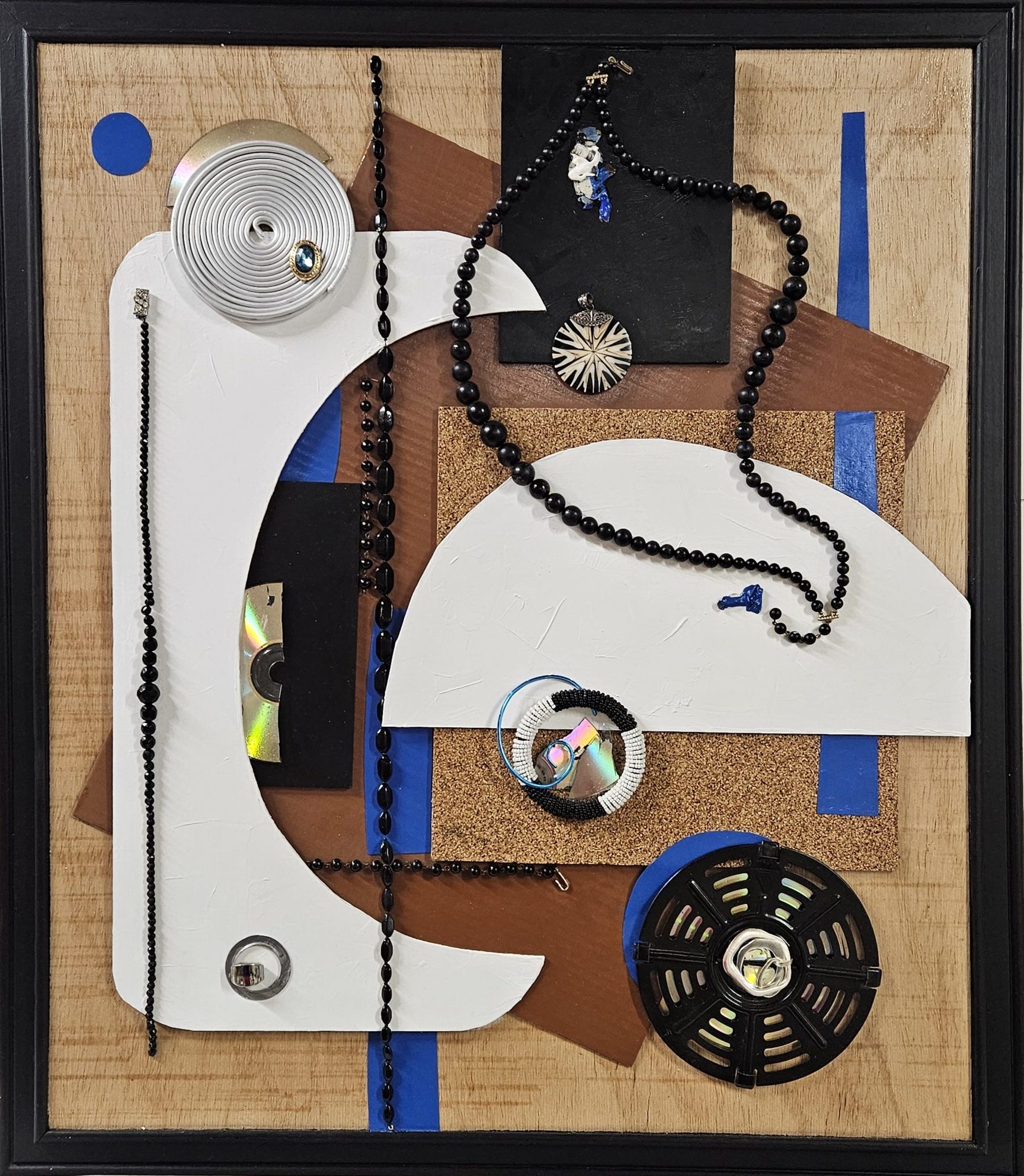 An intriguing collage and assemblage evokes the enigmatic beauty of the past through abstract art. Black Beads uses metal, costume jewelry, cardboard, paper and cork mounted on wood panel in a black frame measuring 27″ x 31″. This piece is a prime example of the gallery’s commitment to exploring modern art. Perfect for collectors wanting to add a touch of wonder to their space.