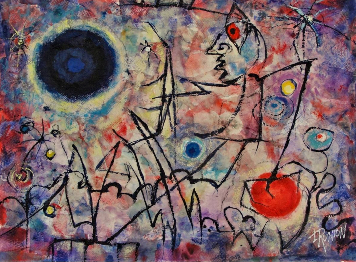 An abstract art painting of a black hole with planets and a celestial face in acrylic using mixed media on textured water color paper, matted in a black frame measuring 31″x25″.